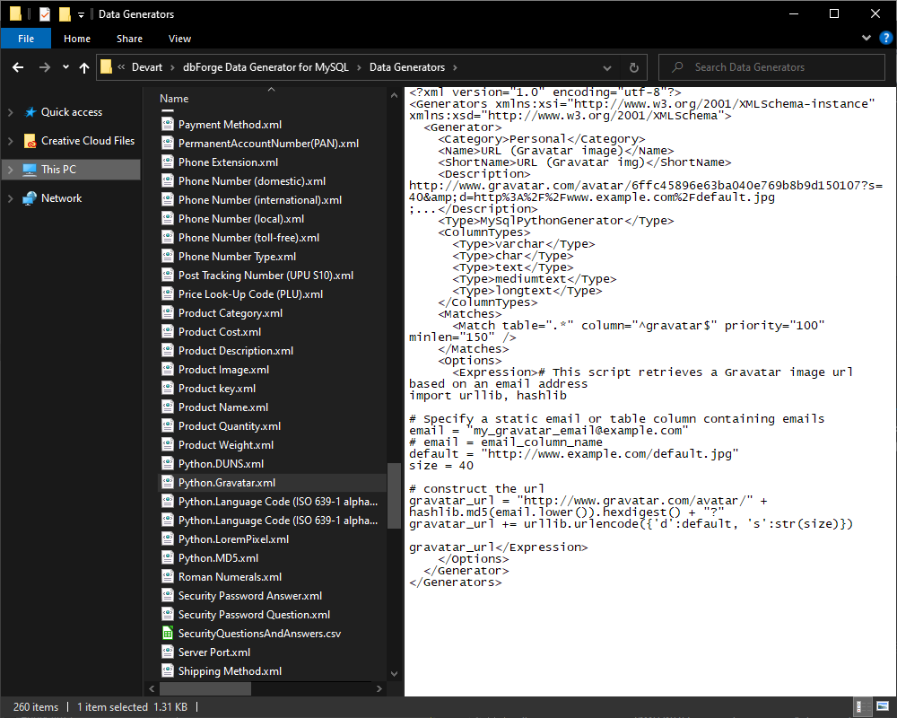 dbForge Data Generator for MySQL is a powerful GUI tool aimed at creating massive volumes of meaningful, realistic test data. The instrument includes a large collection of predefined data generators with customizable configuration options that allow populating MySQL database tables with random data. dbForge Data Generator functionality takes good care of data generation process with its terrific 200+ realistic data generators.